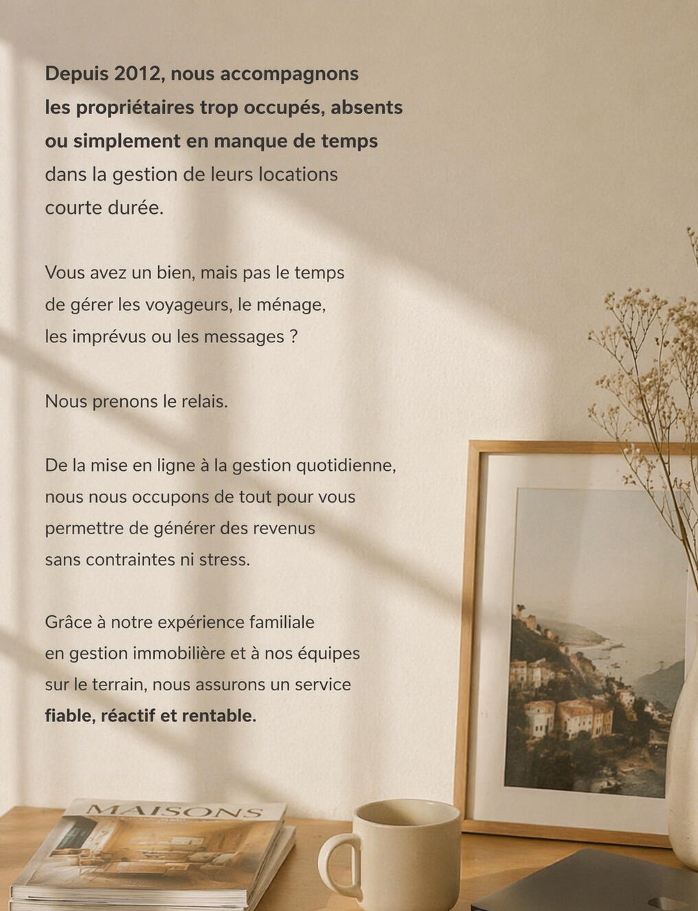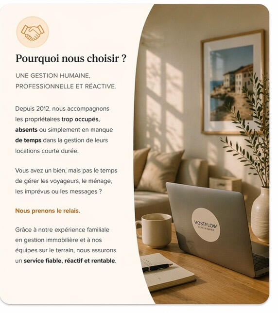 Vous êtes propriétaire, mais vous manquez de temps, êtes souvent absent ou ne souhaitez plus gérer votre bien au quotidien ?Depuis 2012, nous prenons en charge la gestion complète de votre location courte durée pour vous permettre de profiter de vos revenus sans contraintes.