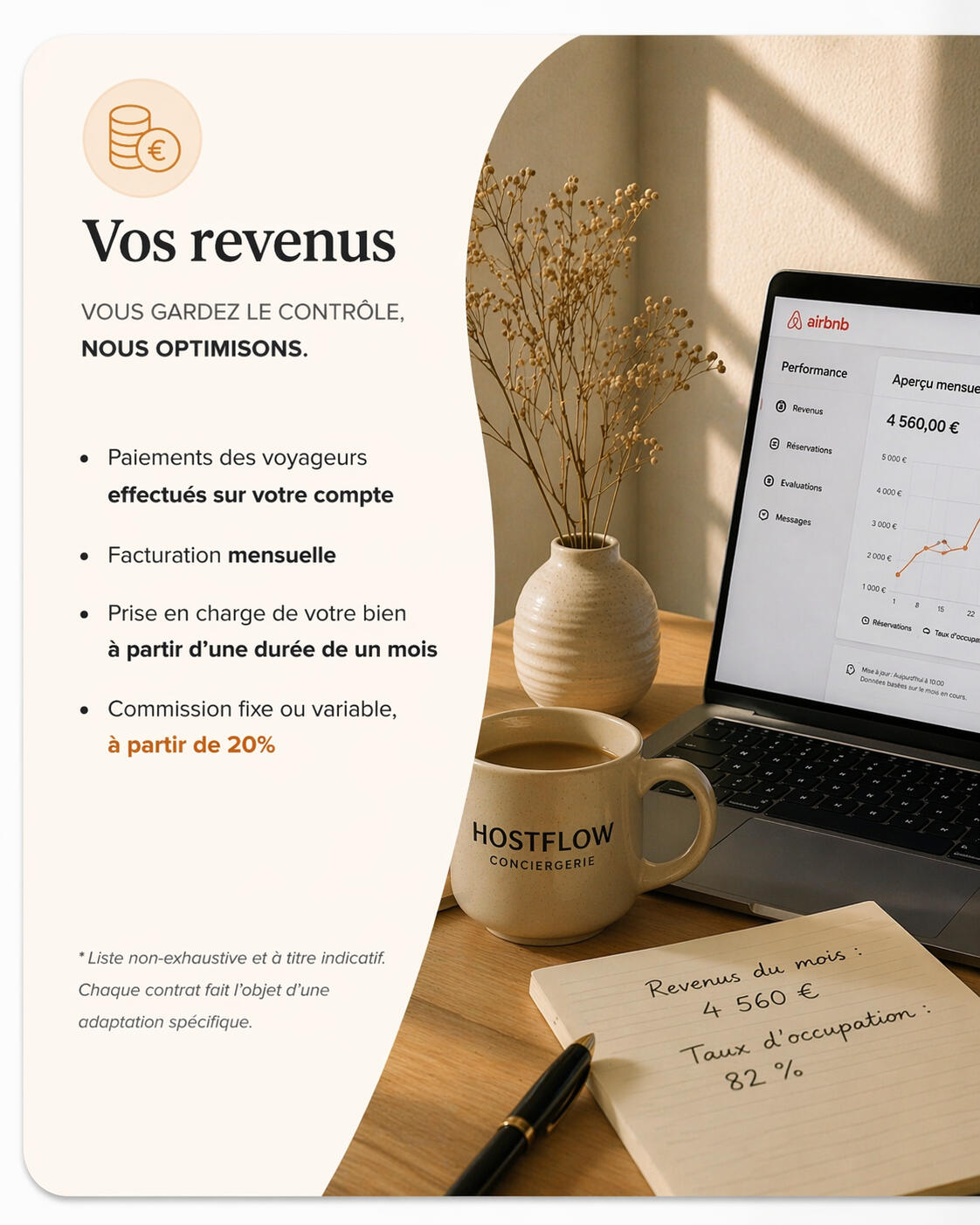 Nous nous occupons de tout, de la réservation à l’accueil des voyageurs, en passant par le suivi et l’optimisation de vos revenus.• Gestion des voyageurs 7j/7